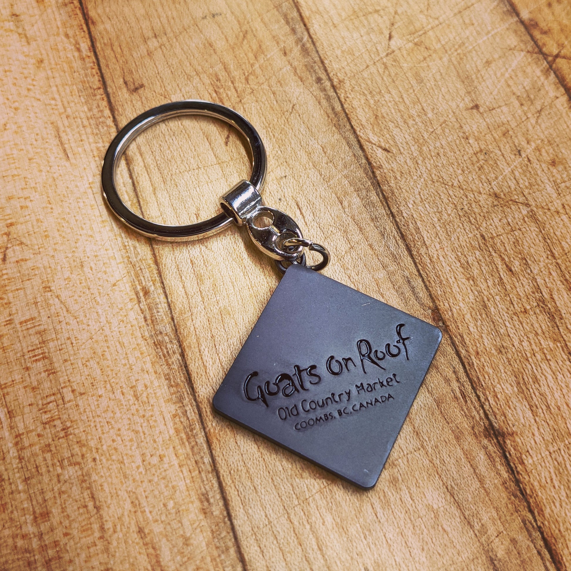 Our world famous logo in a key chain! The classic caution goats on roof design is made of metal with a stainless steel ring attached. The reverse side features the new Goats on Roof logo. This simple symbol will make anyone fondly remember visiting the Old Country Market.