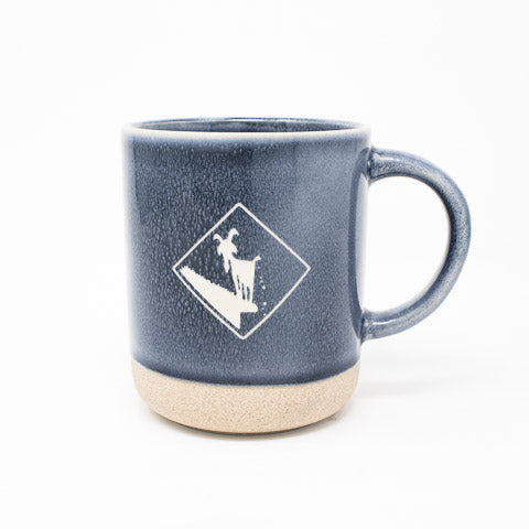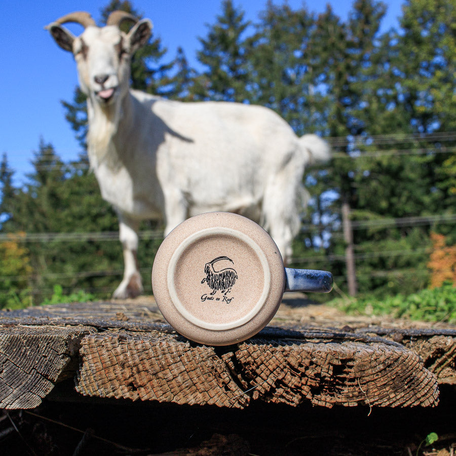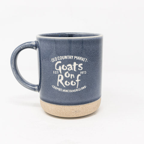 Our new "goats on roof" stoneware mug has our logo engraved right into the glaze, featuring our caution logo on one side and the Old Country Market logo on the other.