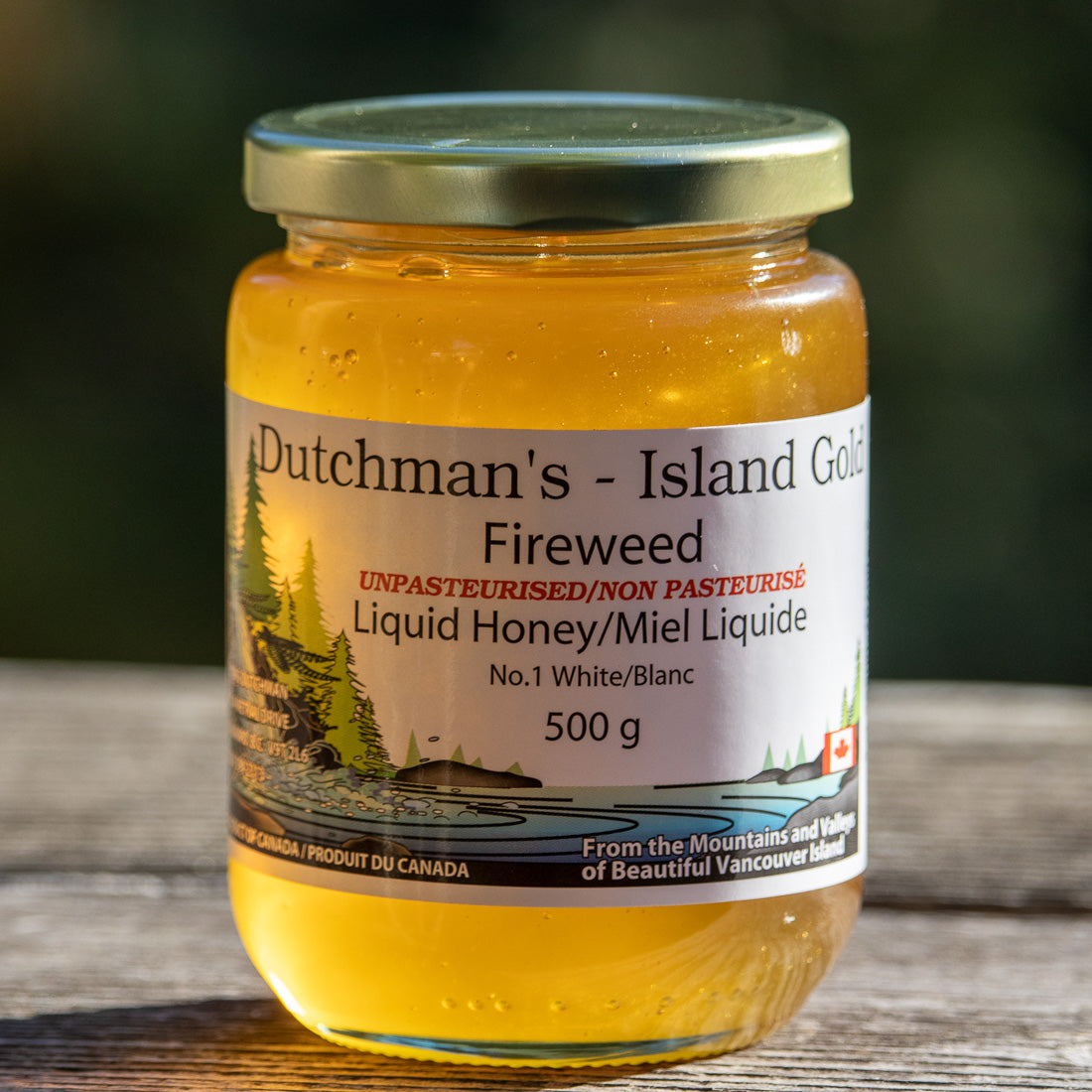 "Dutchman's Island Gold" unpasteurized Vancouver Island fireweed honey; produced by Flying Dutchman of Nanaimo BC.