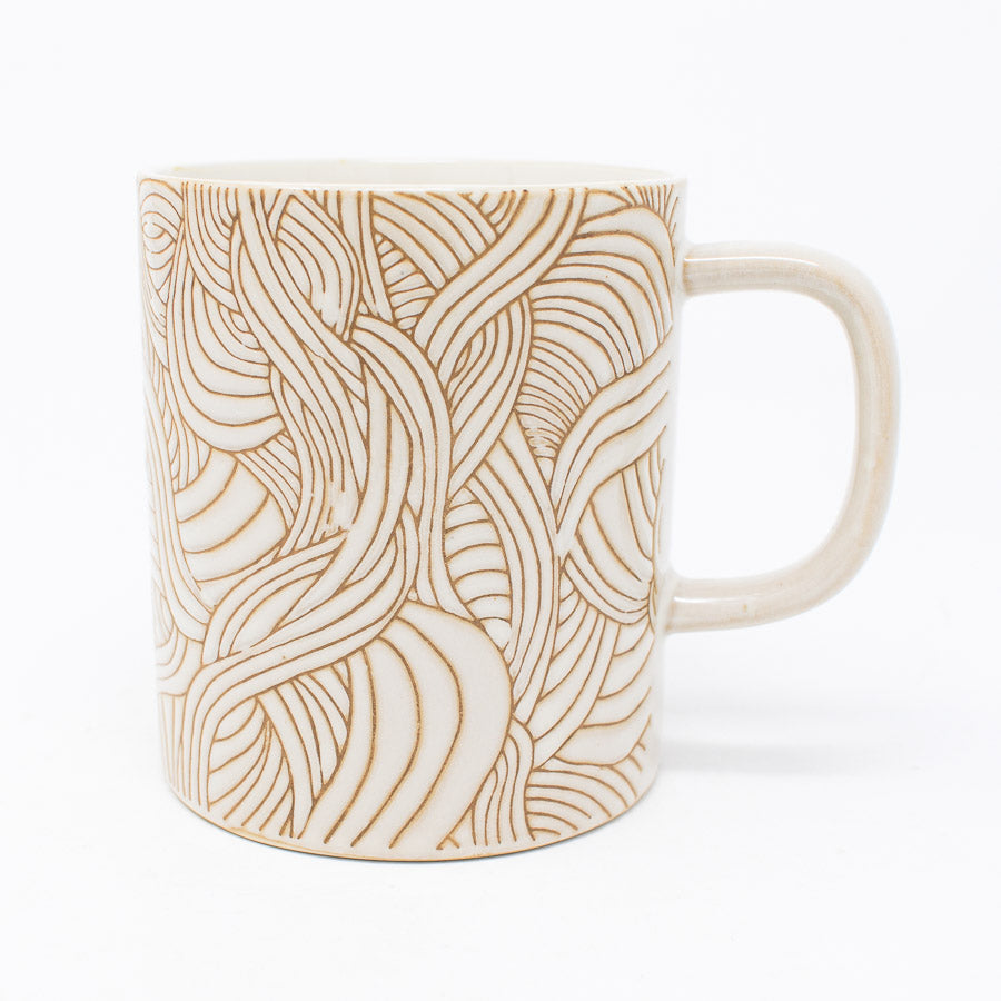 This stoneware mug features a design inspired by the flow of wavy kelp forests.