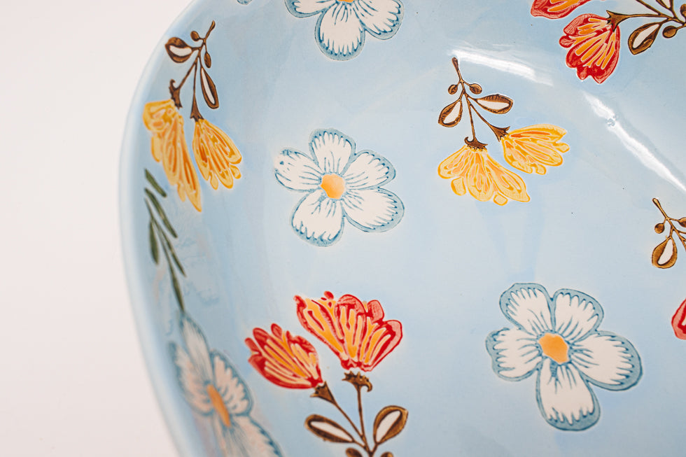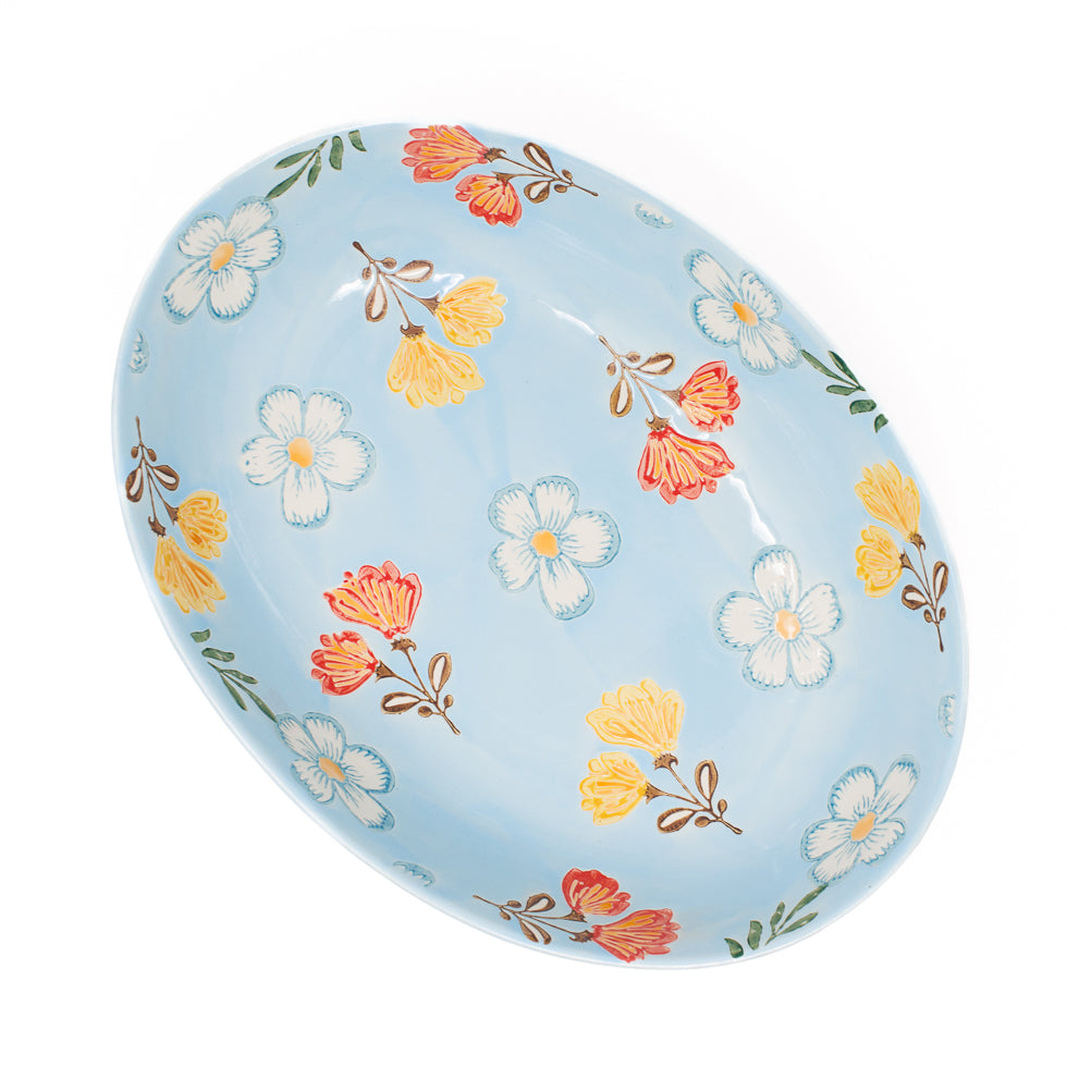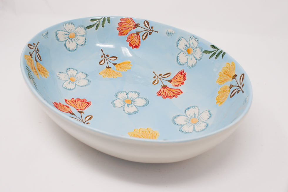 This large blue oval bowl is hand-painted with a floral design designed to match with our smaller ceramic bowls and plates.